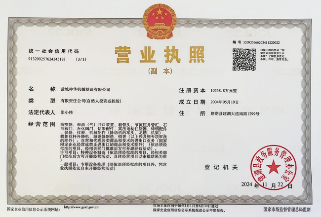 鹽城神華機械制造有限公司為中國石油、石化、海洋物資裝備(集團)總公司的網(wǎng)絡(luò)成員單位,公司注冊資金10558.8萬元整,公司通過了ISO9001國際質(zhì)量體系認(rèn)證,取得了中國船級社船舶產(chǎn)品和配件使用證書。